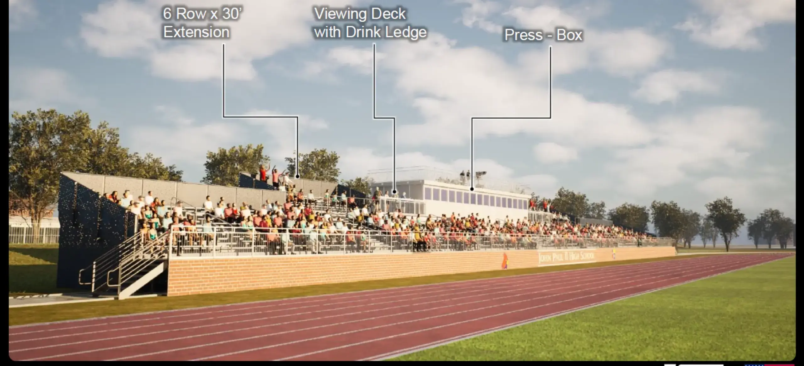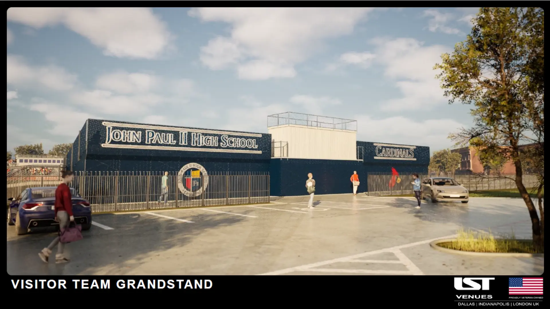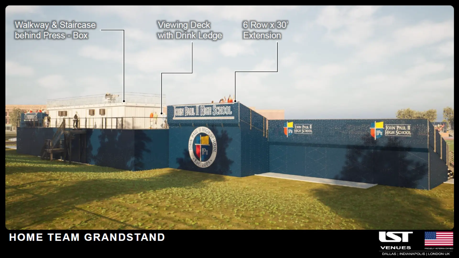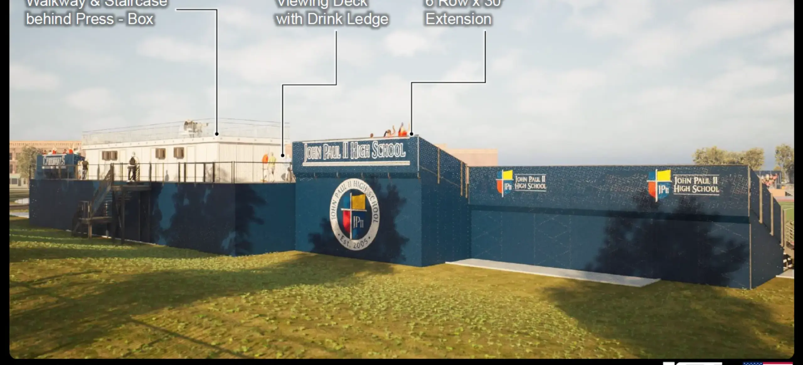 - Improved Seating and Fan Experience: The project adds expanded seating on both sides of the main grandstand, allowing the Cardinal Belles and marching band to join the student section. The structure will feature viewing decks on either side of the press box and be wrapped with JPII branding.