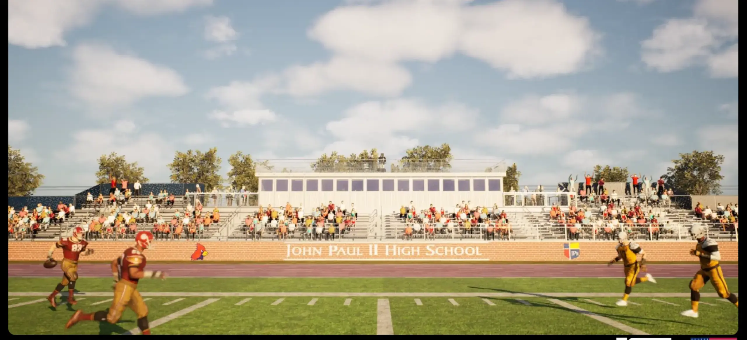 John Paul II High School (JPII) is pleased to announce a significant capital project that will significantly enhance the school's athletic facilities for teams, fine art programs, and expand opportunities for its growing student communications program. The project, made possible through the extraordinary generosity and vision of donors Mary and Rich Templeton, includes a new full-size turf competition field and an expansion of the main stadium's home side grandstand and press box.