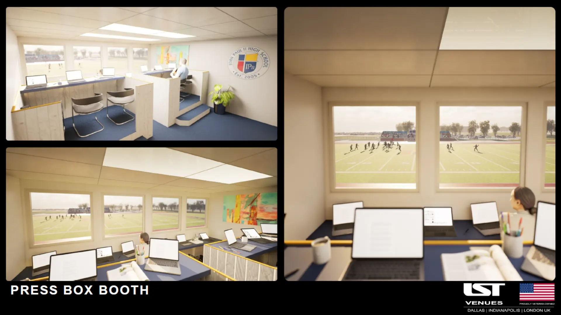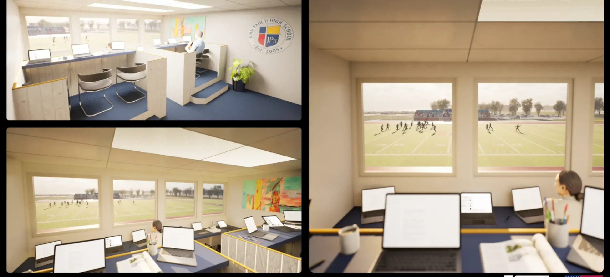 - Press Box Expansion: The expanded press box will include more space to accommodate JPII's growing Mass Communication and student livestream programs. It will feature a separate coaches' box from the main announcers' area, a fourth space for guests and hospitality, and access via a staircase behind the press box.
