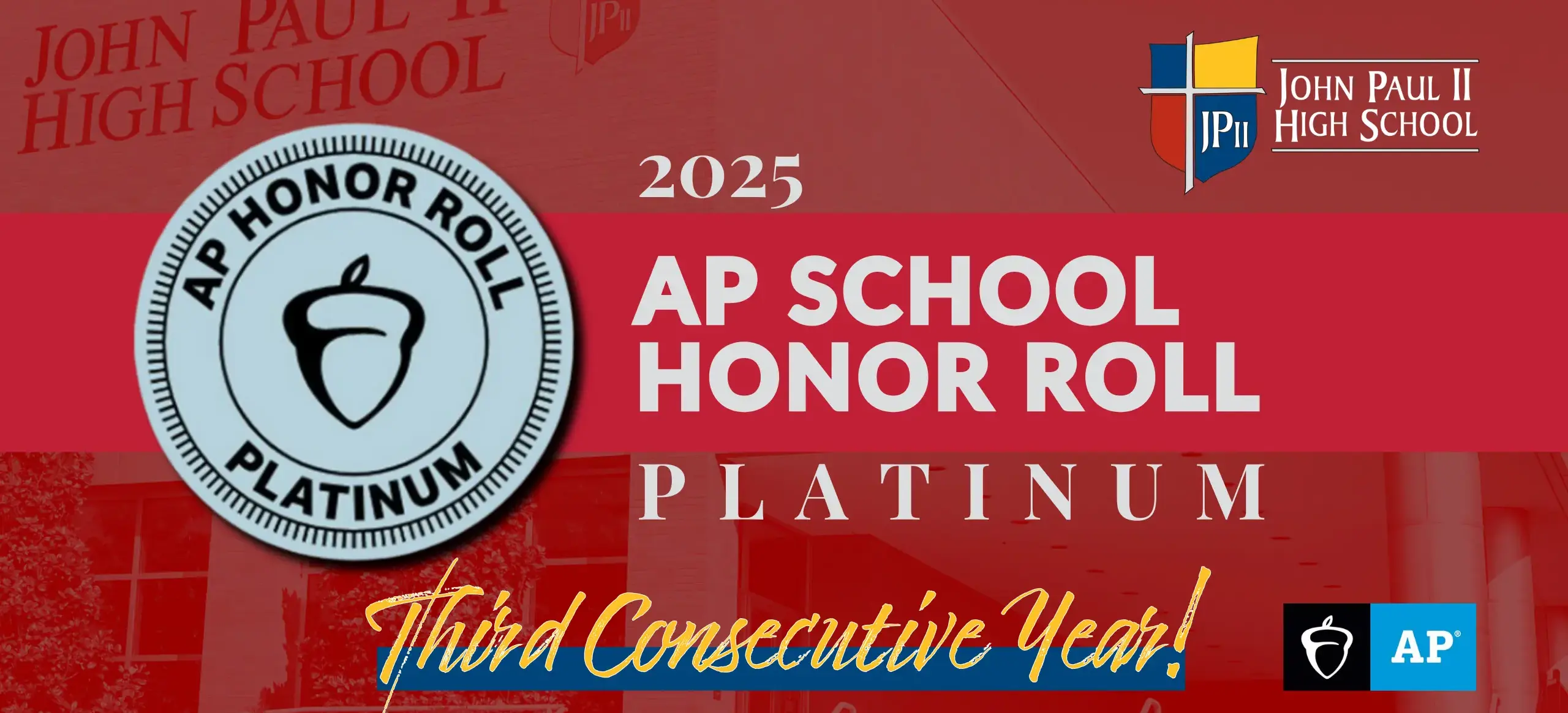 John Paul II has been recognized on the AP® School Honor Roll for the 2024-25 school year for promoting a college-going culture, expanding opportunities for students to earn college credit, maximizing college readiness, and providing a clear and effective commitment to equitable access to advanced coursework.